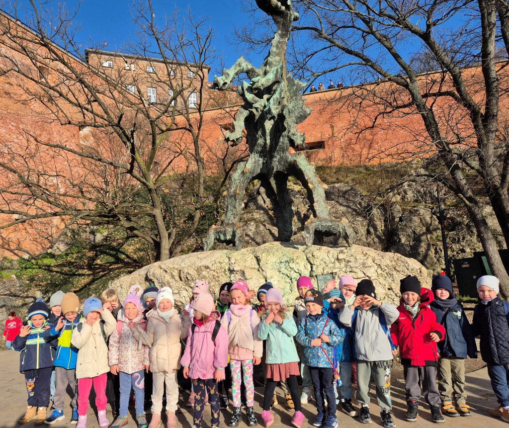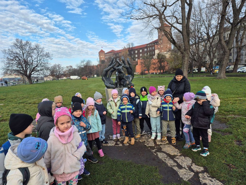 Dnia 14 listopada wybraliśmy się na wycieczkę na Zamek Królewski na Wawelu. Idąc od strony mostu Grunwaldzkiego na Wawel zatrzymaliśmy się przy pomniku Psa Dżoka – symbolu psiej wierności. Bardzo wzruszyła nas opowieść o Dżoku, najwierniejszym z wiernych, który przez rok oczekiwał na swojego Pana.
