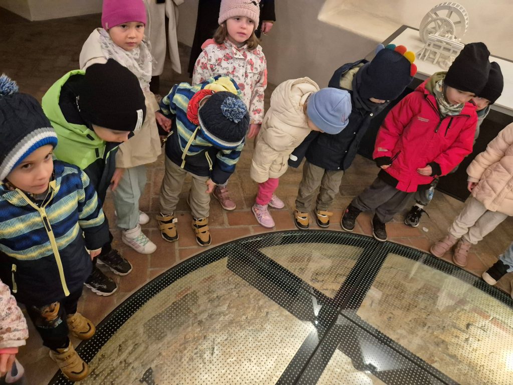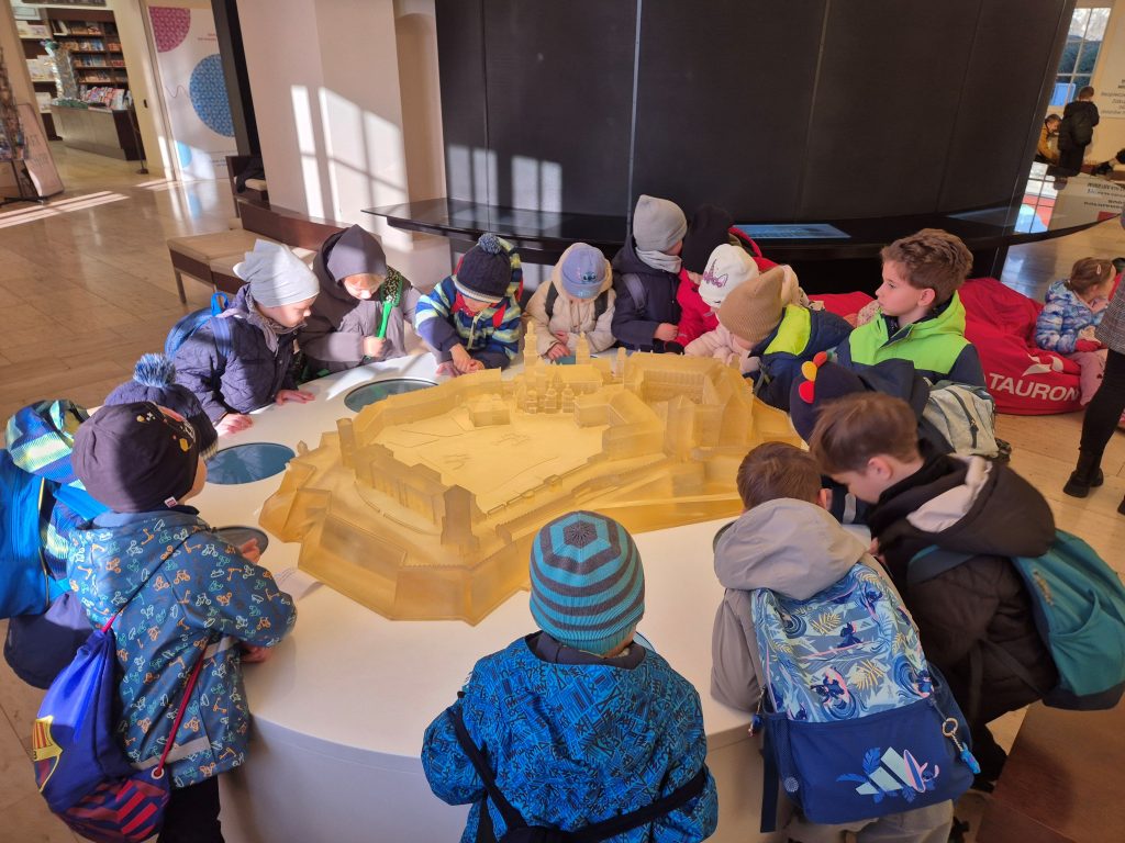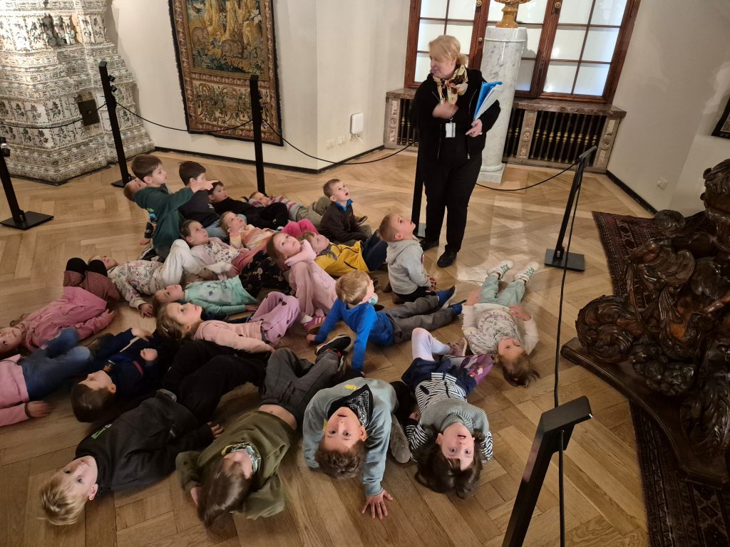 Następnie spacerkiem wzdłuż bulwarów udaliśmy się na wzgórze, gdzie przy pięknej pogodzie obserwowaliśmy widoki na Wisłę. Kolejnym punktem naszego zwiedzania była Katedra Wawelska, gdzie podziwialiśmy jej wnętrze, a także krypty, gdzie znajdują się Groby Królów Polski i wielkich Polaków. Po zwiedzeniu Katedry i „małym co nieco” na ławeczkach obok pięknych, różanych ogrodów udaliśmy się na Lekcję muzealną „Życie codzienne na zamku”. Na dziedzińcu powitała nas Przewodniczka – Pani Larisa i od razu wprowadziła nas w królewski klimat. Poznaliśmy dawnych mieszkańców zamku, ich obyczaje, kulturę i ceremoniał dworu królewskiego. Dowiedzieliśmy się, jakie było przeznaczenie poszczególnych sal i do czego służył zgromadzony tam sprzęt, poznaliśmy również tajniki przyrządzania królewskiego menu.